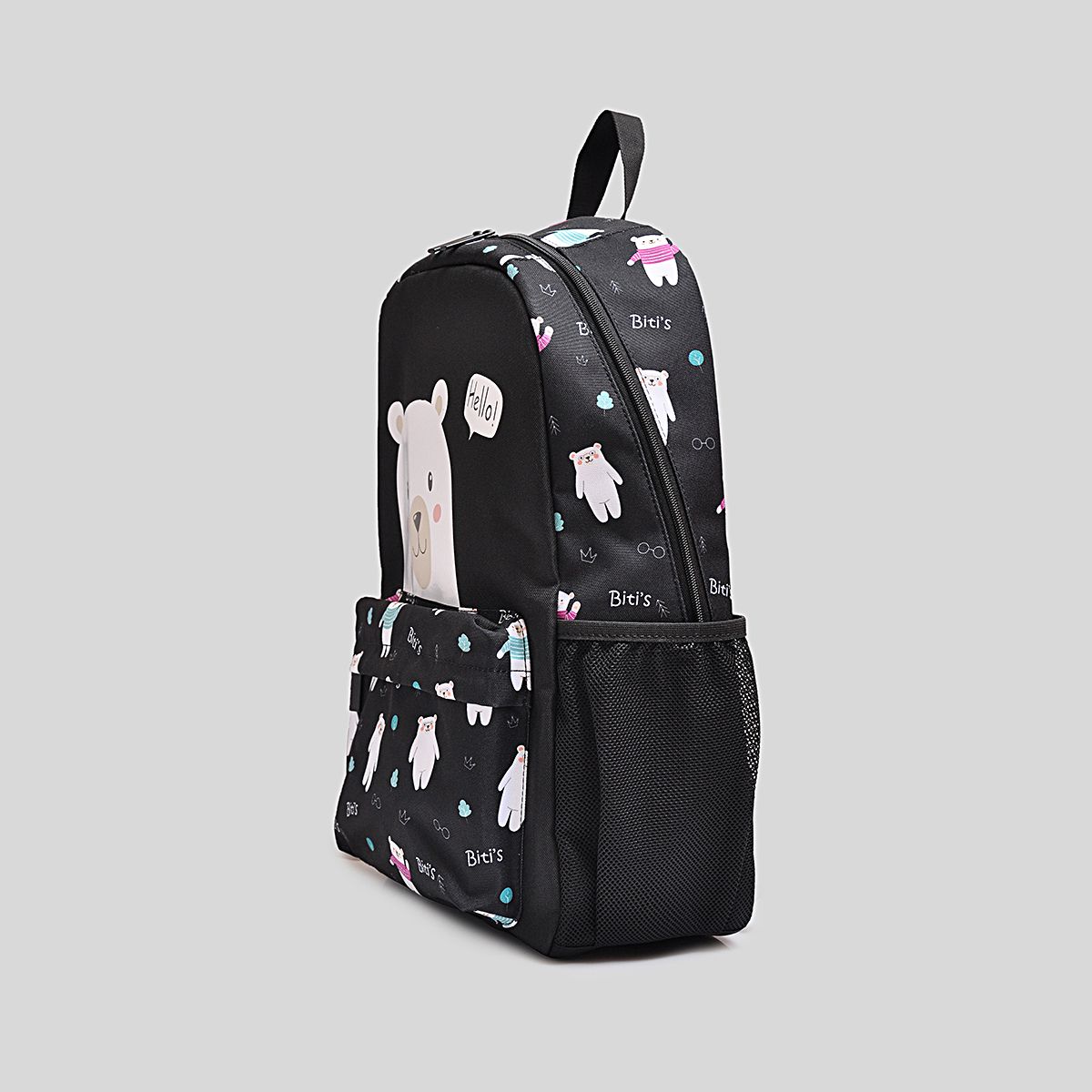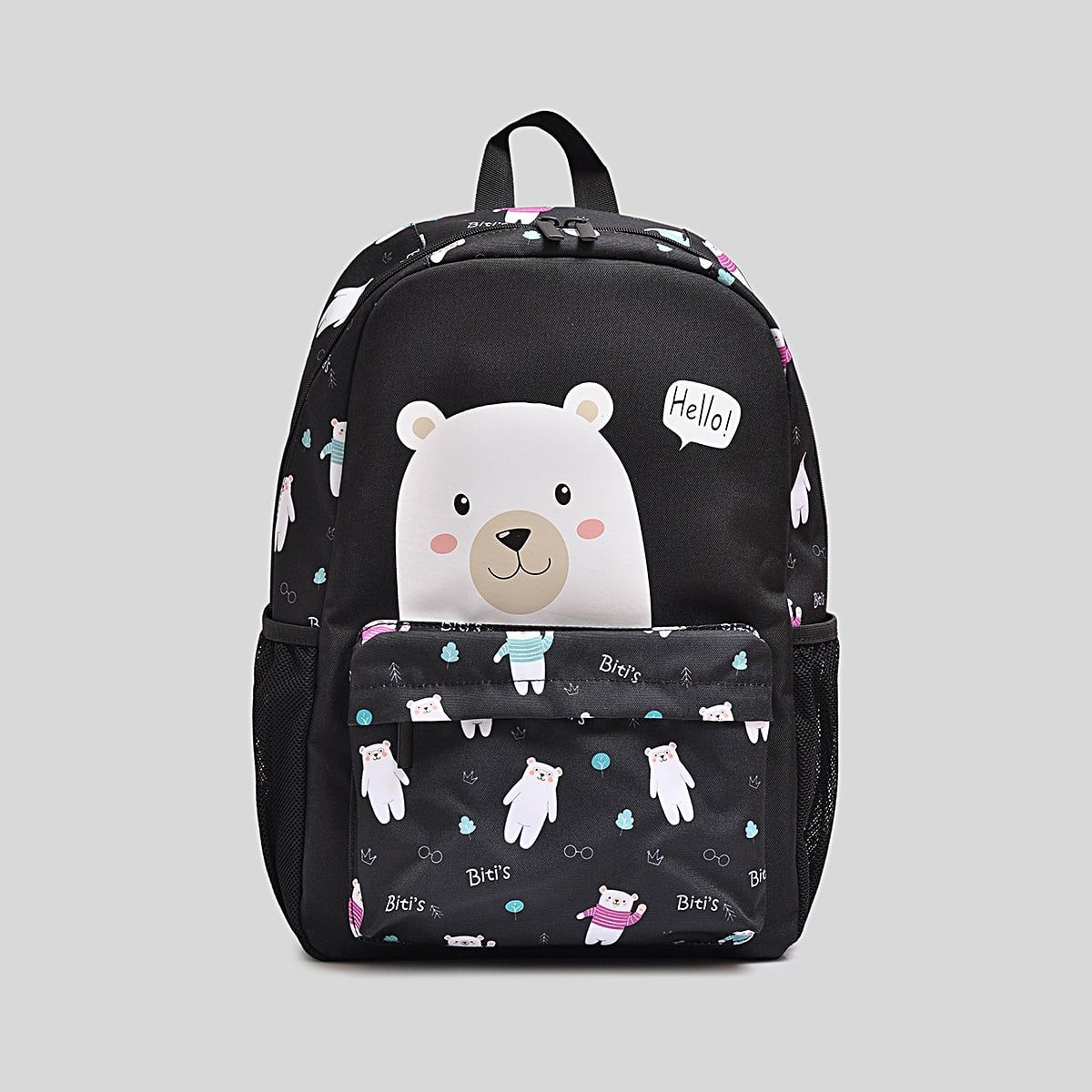 Balo trẻ em Biti's BBBG01900DEN màu đen là sự lựa chọn hoàn hảo cho bé trong những ngày đến trường hoặc đi dã ngoại. Thiết kế nổi bật với họa tiết gấu ngộ nghĩnh, tạo điểm nhấn dễ thương và gần gũi với các bé. Phần trước balo được in hình gấu lớn kèm lời chào “Hello!” giúp sản phẩm thêm sinh động, thu hút ánh nhìn ngay từ lần đầu tiên.