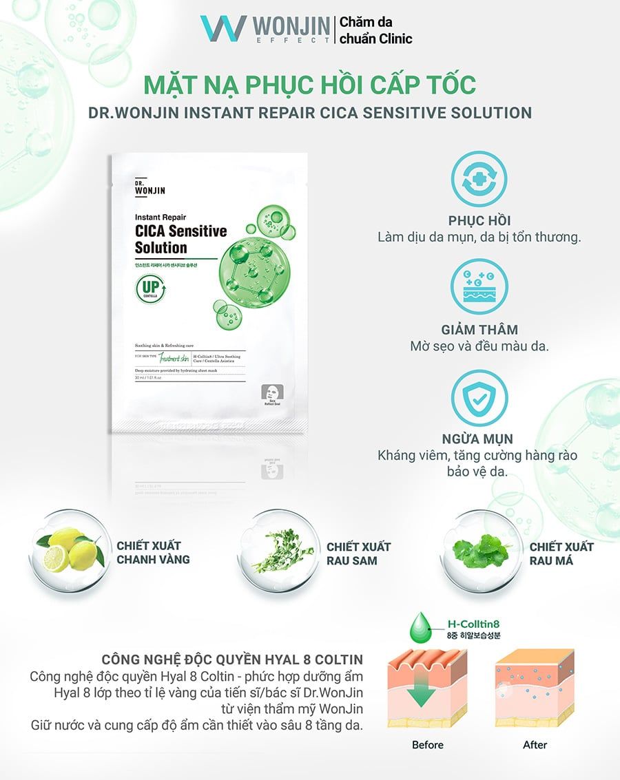 - Mặt Nạ Dr.Wonjin Instant Repair Cica Sensitive Solution Phục Hồi, Làm Dịu Cấp Tốc 30g giúp làm dịu da mụn, da tổn thương đồng thời tăng cường hàng rào bảo vệ da.