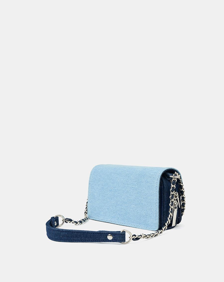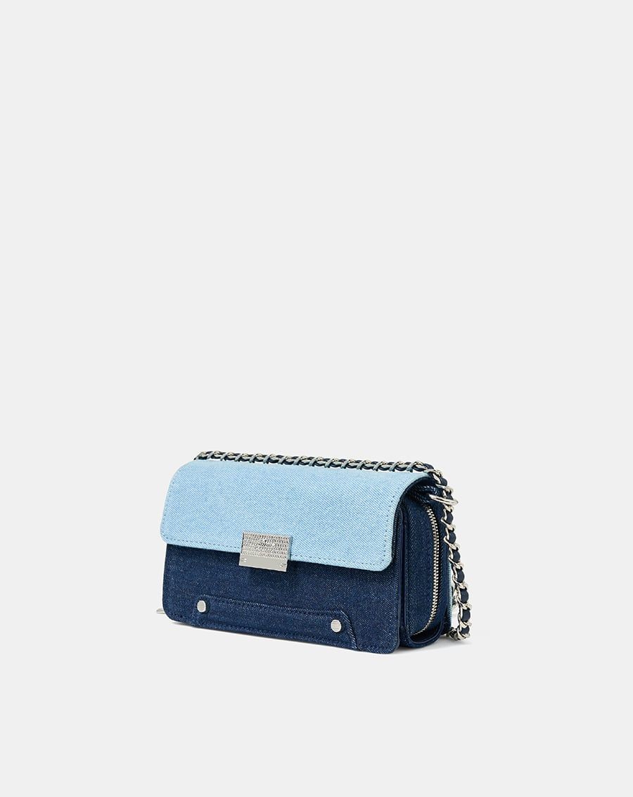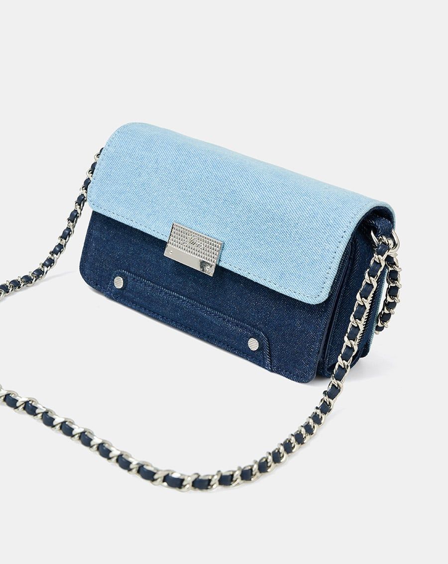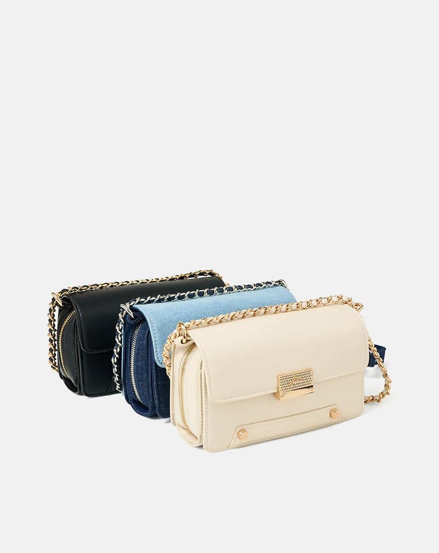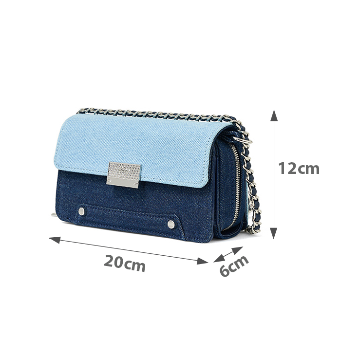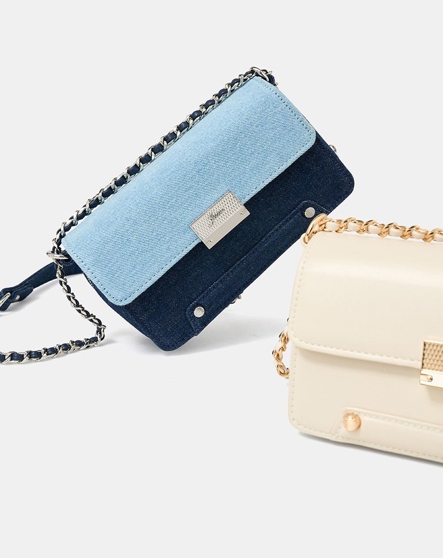 Form túi basic cùng chất liệu da tổng hợp và jean được làm nổi bật bởi các chi tiết tinh tế