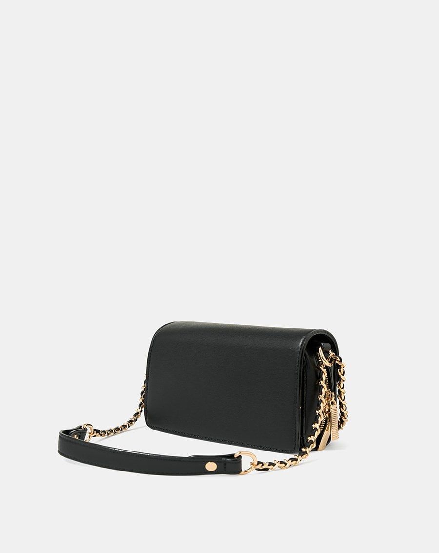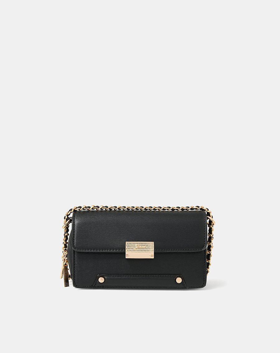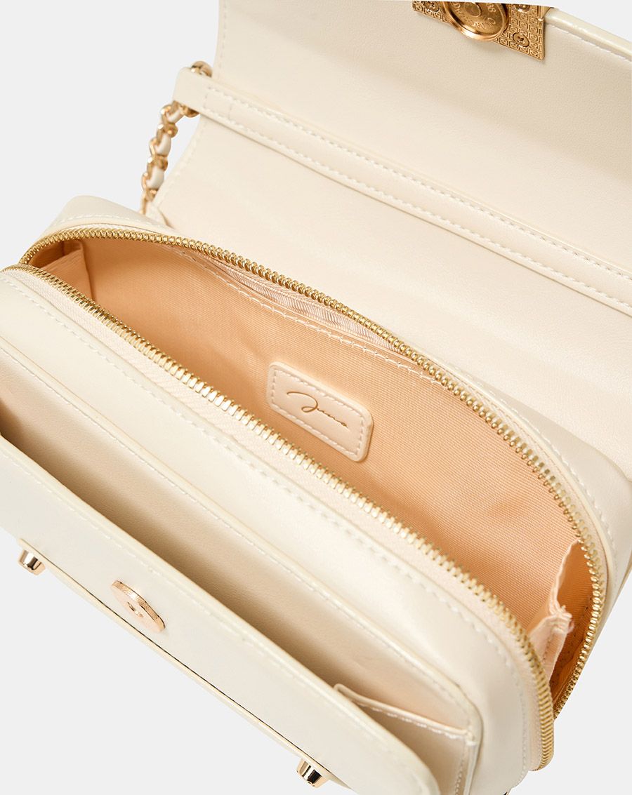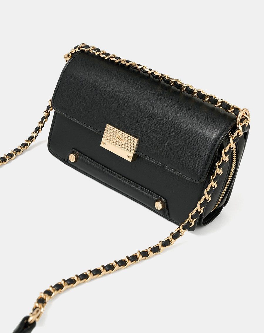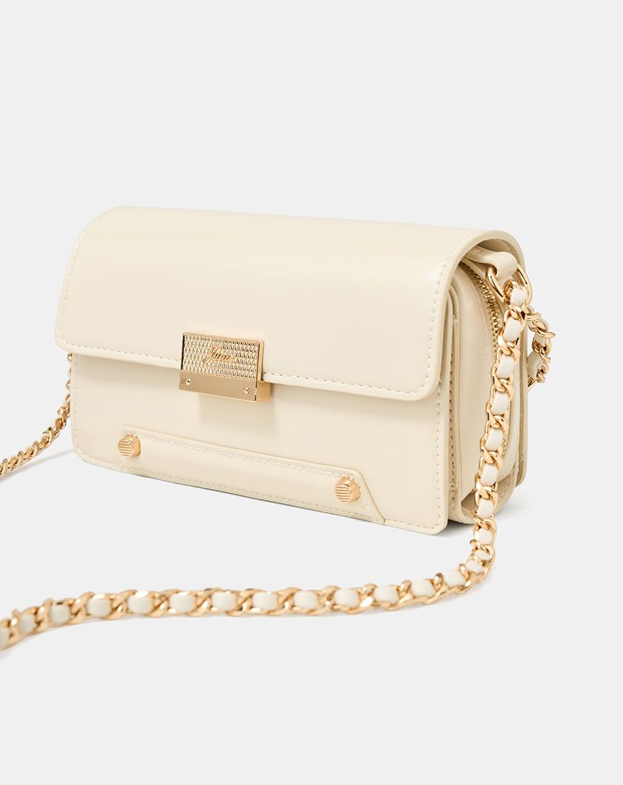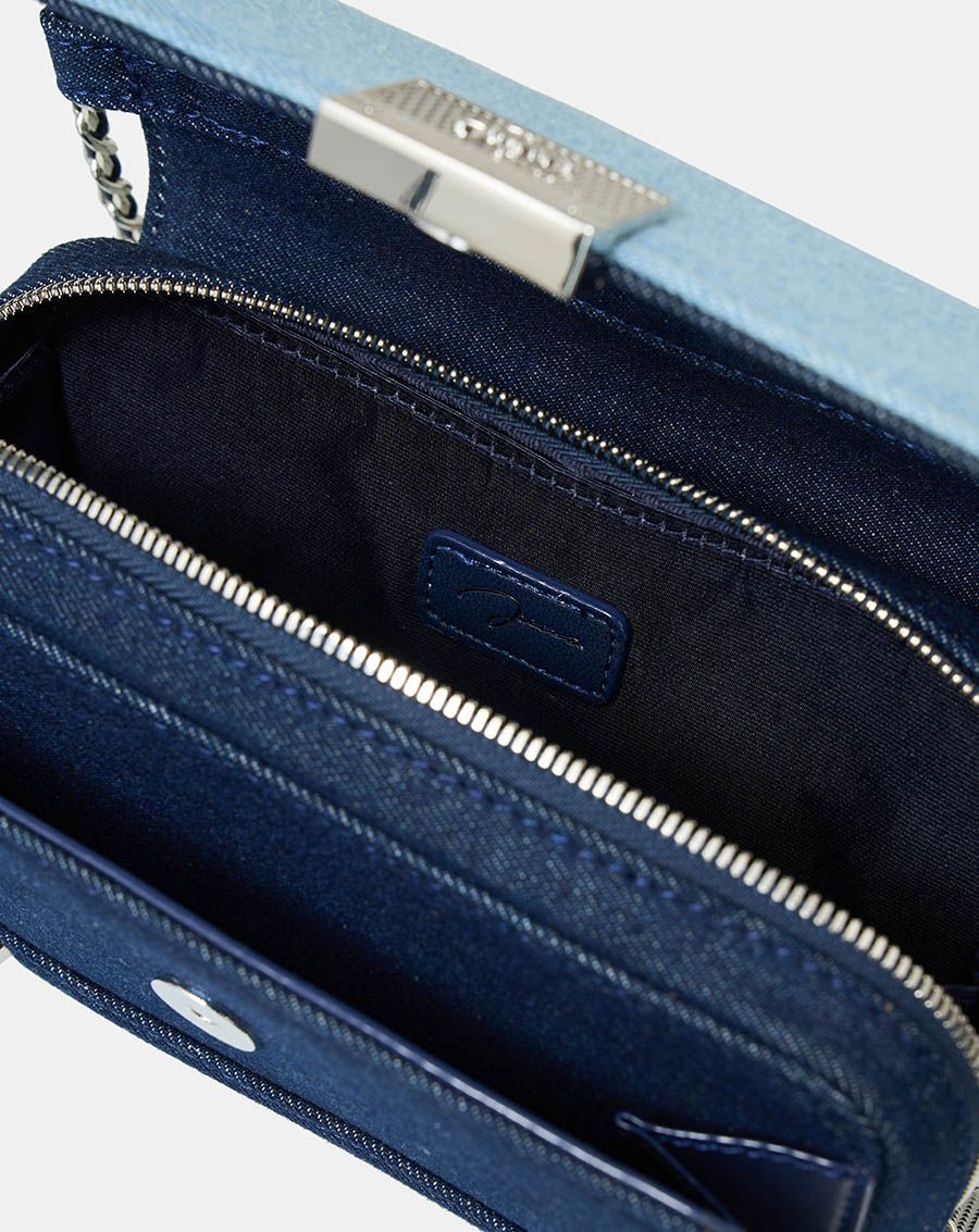 Form túi basic cùng chất liệu da tổng hợp và jean được làm nổi bật bởi các chi tiết tinh tế